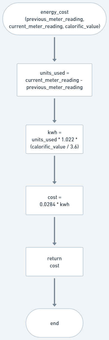 Write a program that calculates the cost of energy from a previous and current meter reading. The kilowatt hours is the total units_used between the two readings multiplied by 1.022 multiplied by the calorific_value divided by 3.6. The cost in pounds sterling is 0.0284 multiplied by kilowatt hours.